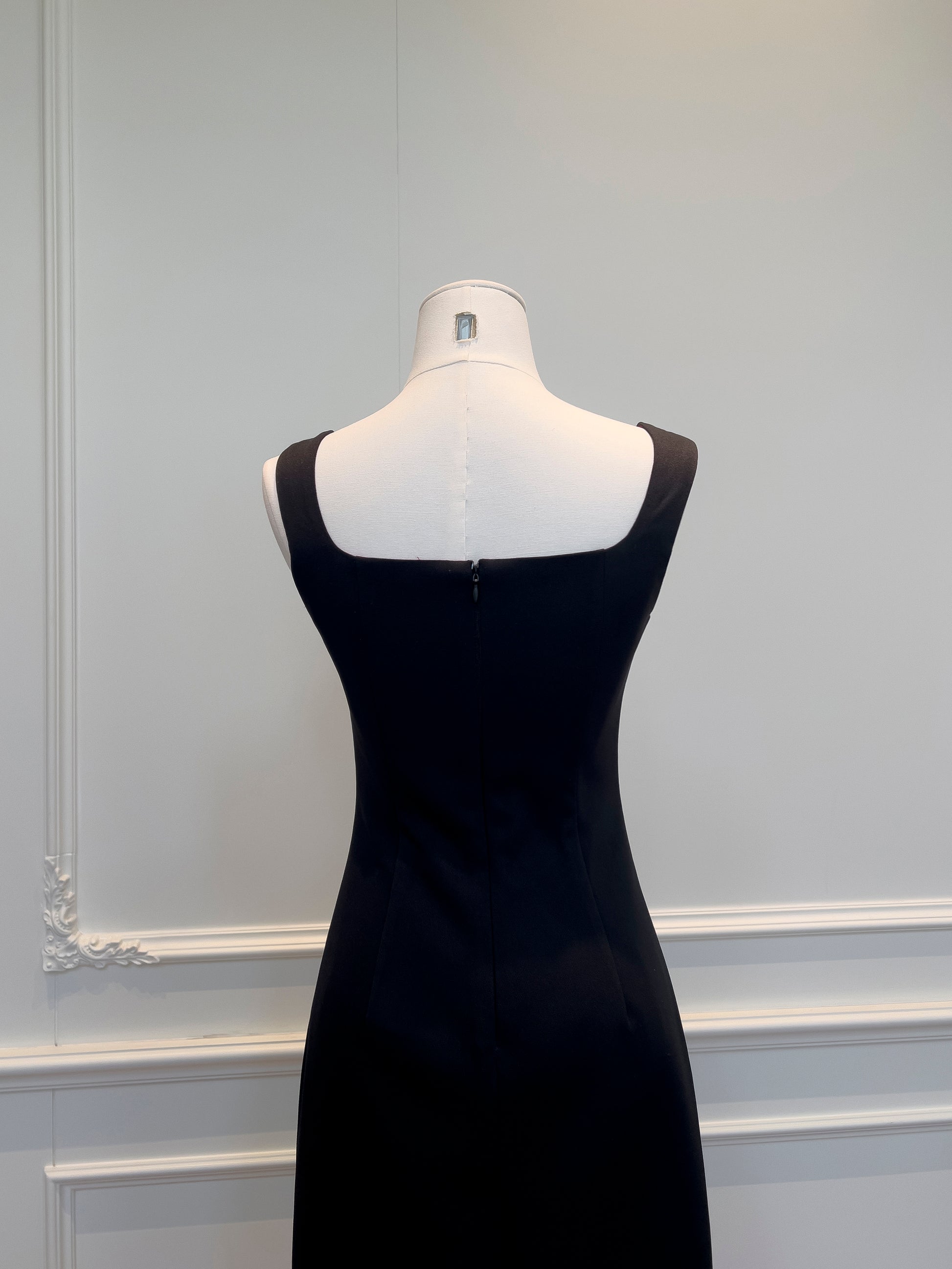 This sleek side-slit dress features a flattering body-hugging cut, elegant straight neckline, and built-in soft bust pads for natural shaping and support.